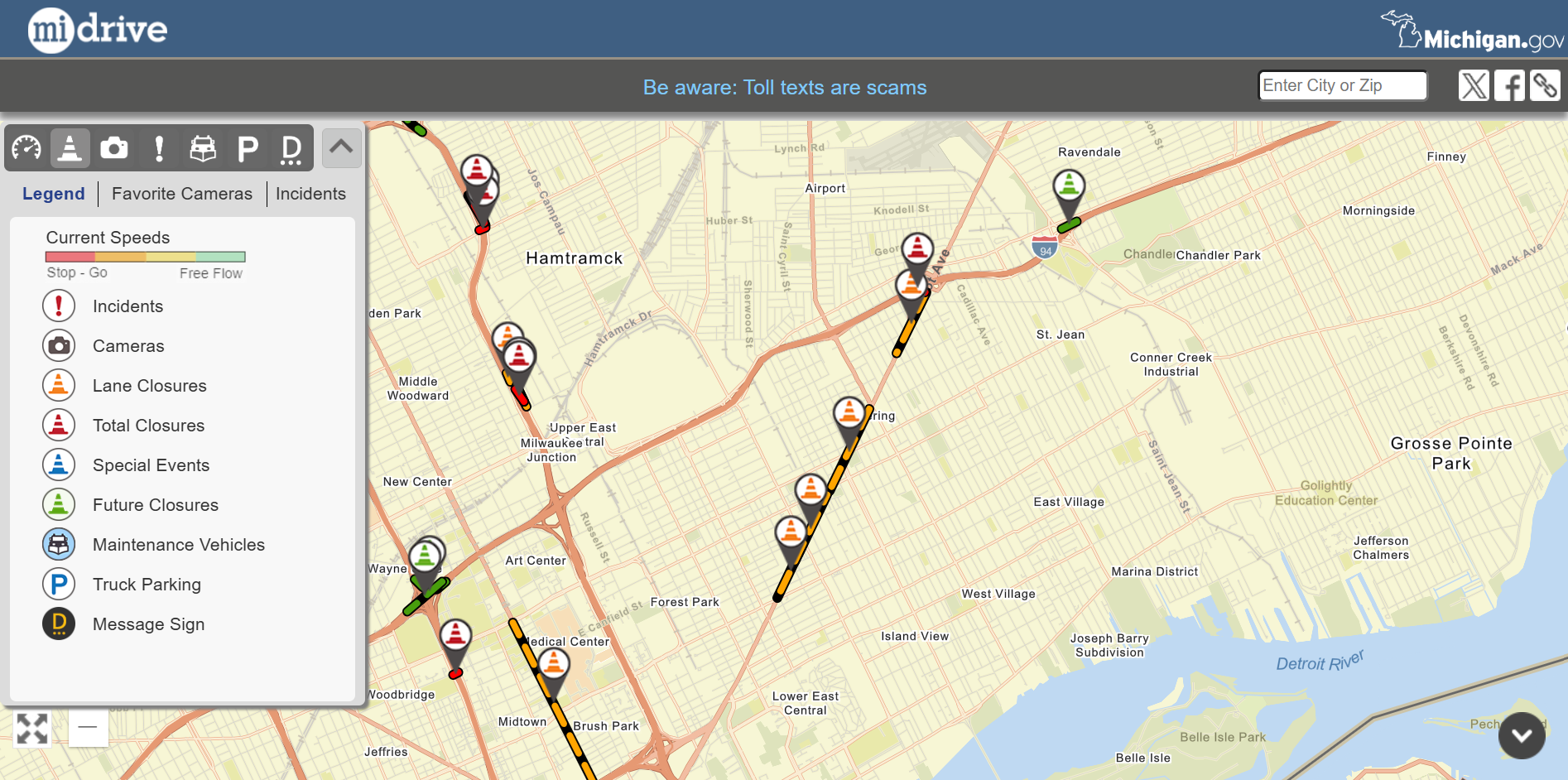 To view traffic cameras, speeds, locate incidents, and construction, be sure to check out the interactive website hosted by the Michigan Dept. of Transportation, MiDrive.